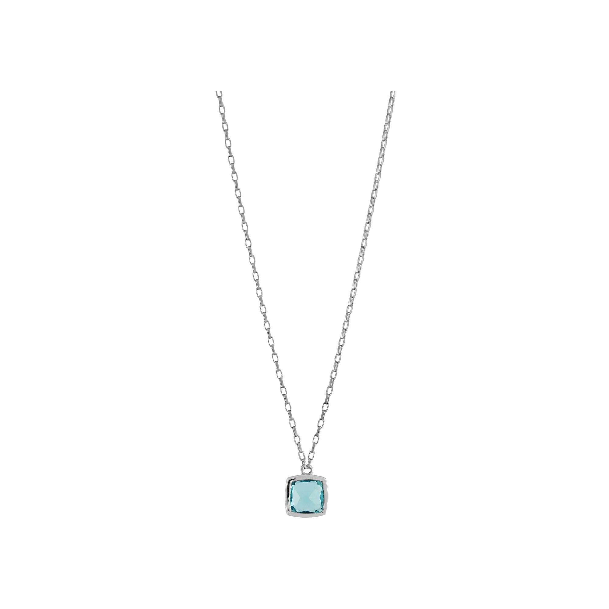 Collier argent rhodié pendentif carré pierre synthétique bleue ciel avec entourage 43+3cm